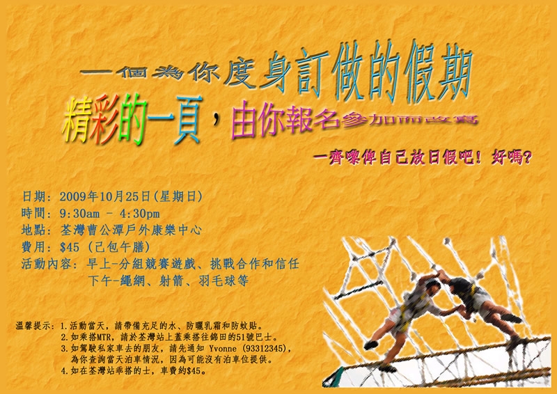 時間: 9:30am - 4:30pm 地點: 荃灣曹公潭户外康樂中心 費同: $45 (已包午膳) |